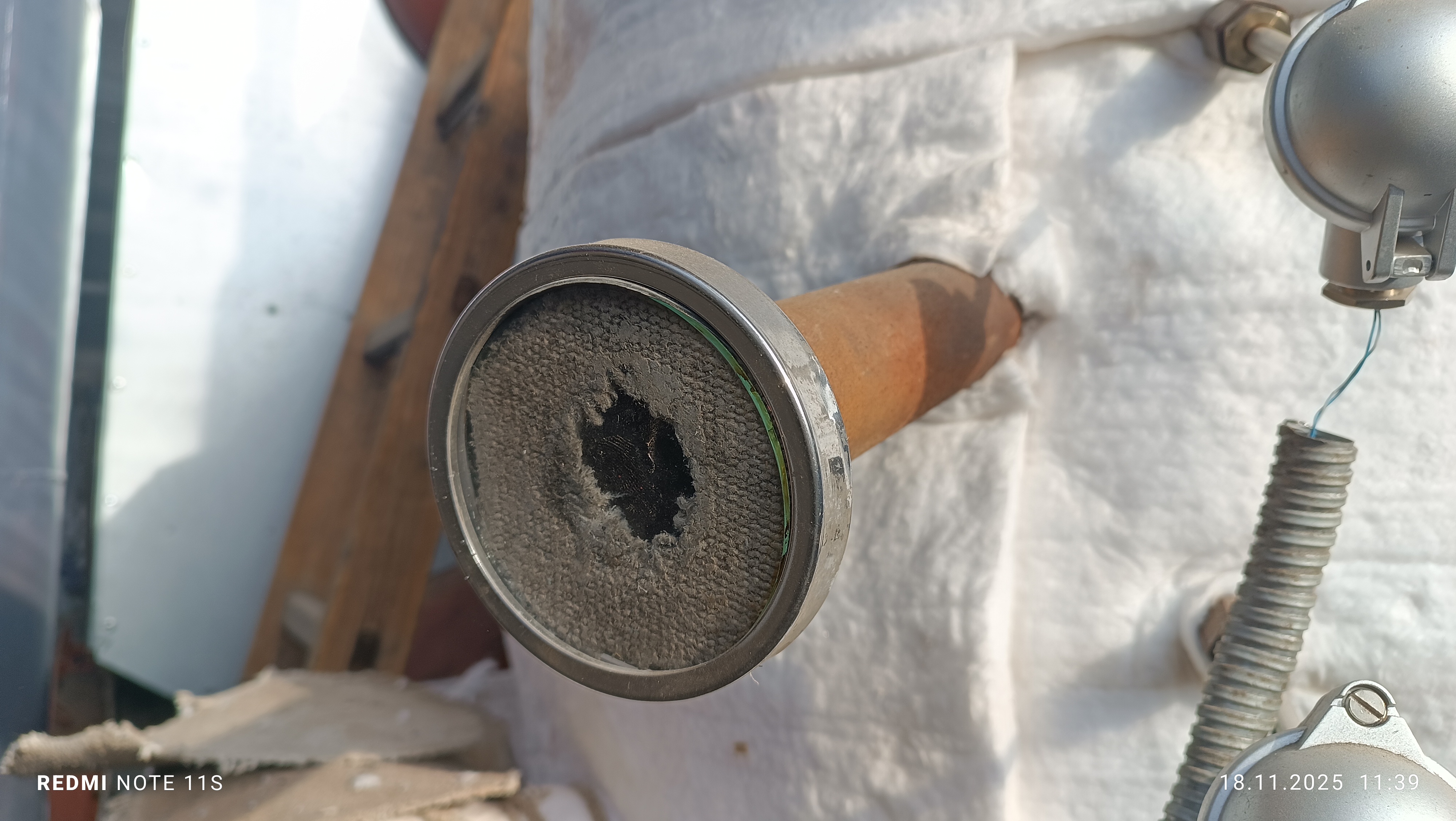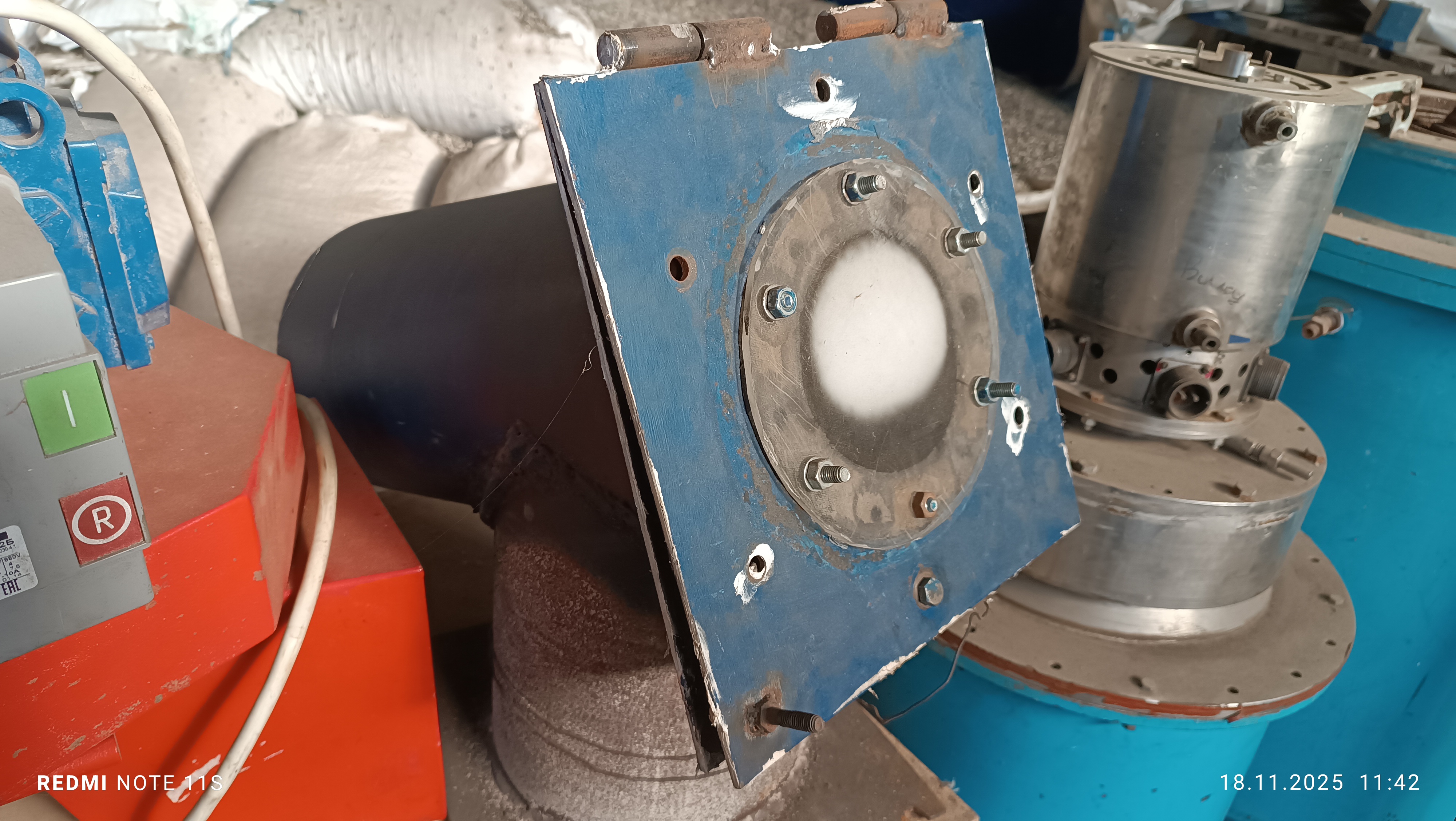 Изначально конструкция экспериментального реактора оксипиролиза не предполагала визуального контроля процесса энергетической утилизации АТ. Вероятность проведения экспериментальных исследований вслепую нас не устраивала. Решено, не сильно вмешиваясь в конструкцию реактора, установить гляделки в обе его камеры. Если с гляделкой на второй камере было всё просто — пробили отверстие и приварили трубу с фланцем на боковую стенку, в последующем дополнив стеклом и крышкой, то с гляделкой первичной камеры пришлось повозиться. В результате наблюдение за процессом в ней было организованно через верх, а точнее через оголовок шнека. Такому решению способствовало исключение из системы подачи опорного подшипникового узла шнека. Именно на его место было установлено оргстекло. Возможность его быстрой периодической замены тоже было предусмотрено. А также это соединение перестало быть глухим и стало разъемным — на петлях. Теперь через оголовок системы подачи мы могли наблюдать за процессом равномерной подачи топлива, процессом его пиролиза в первичной камере, контролировать визуально замятия топлива и забивание оголовка и своевременно устранять вероятность аварийной ситуации. Удобство эксплуатации реактора заметно возросло.
