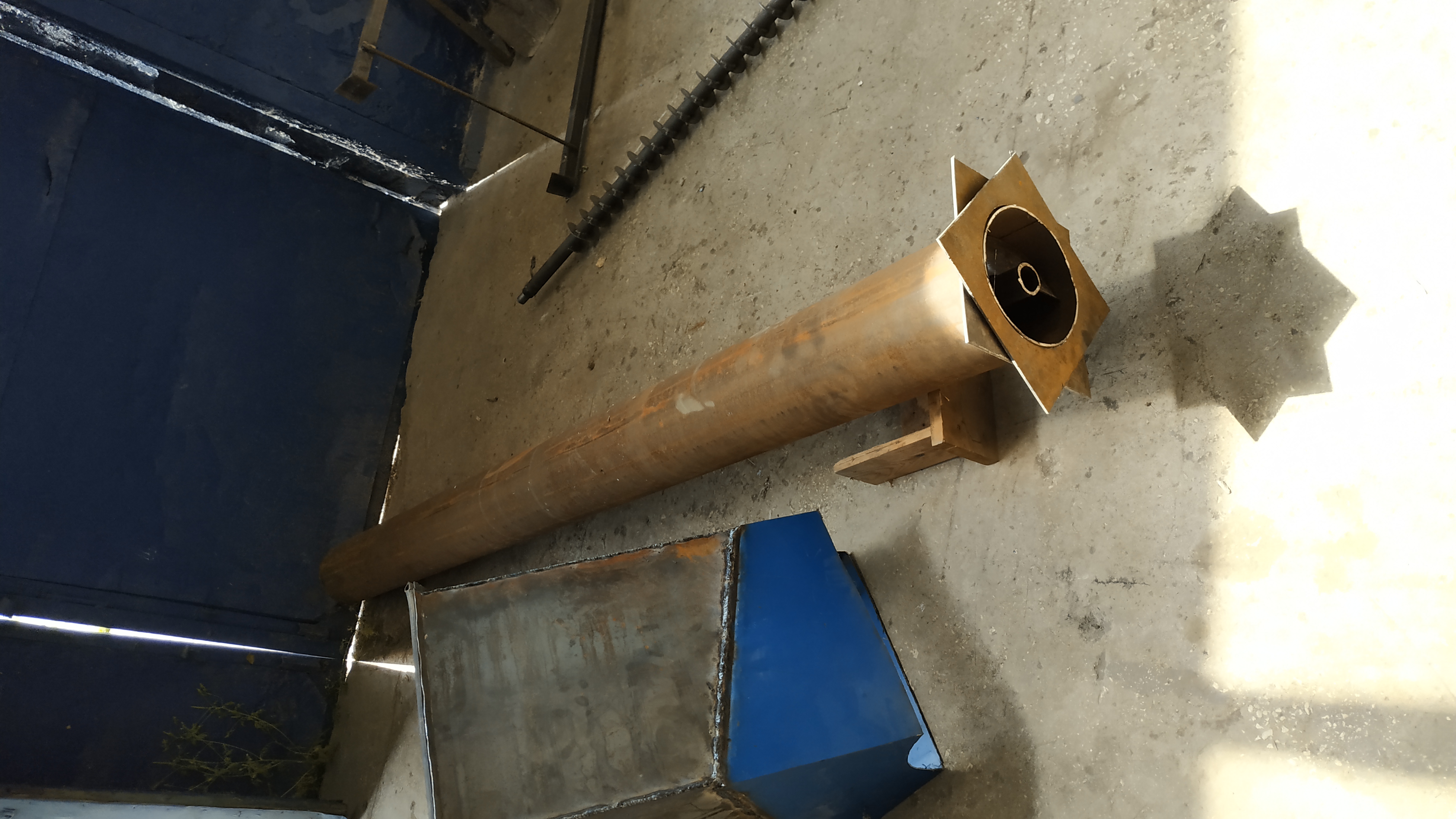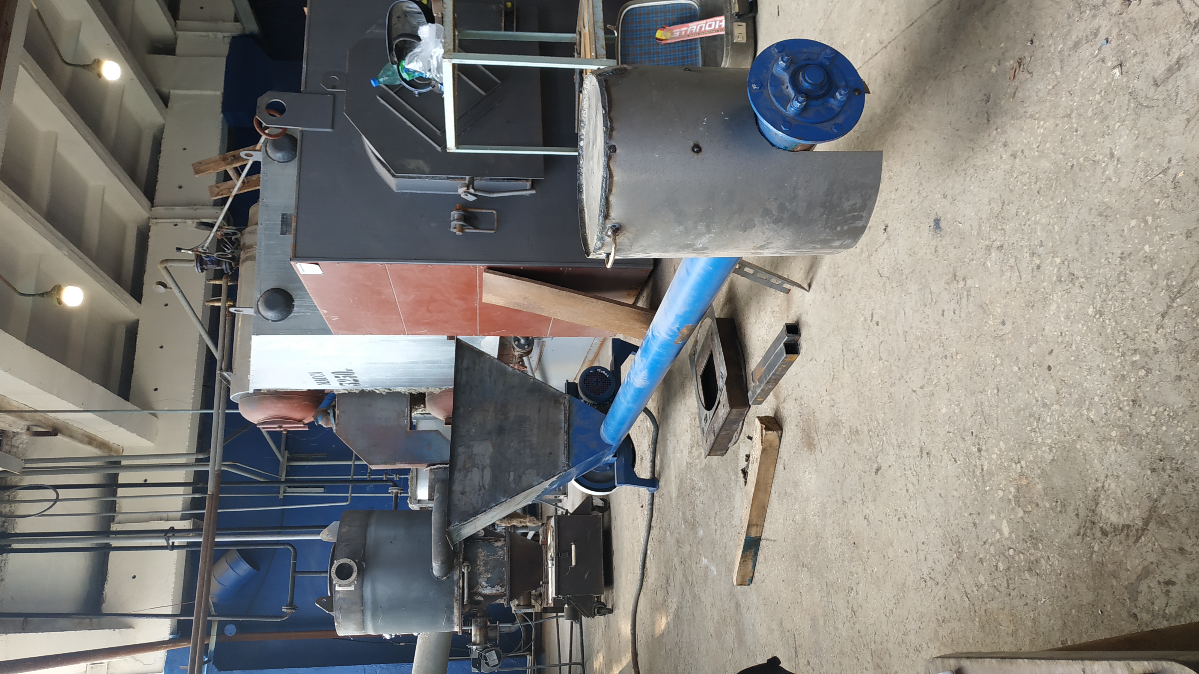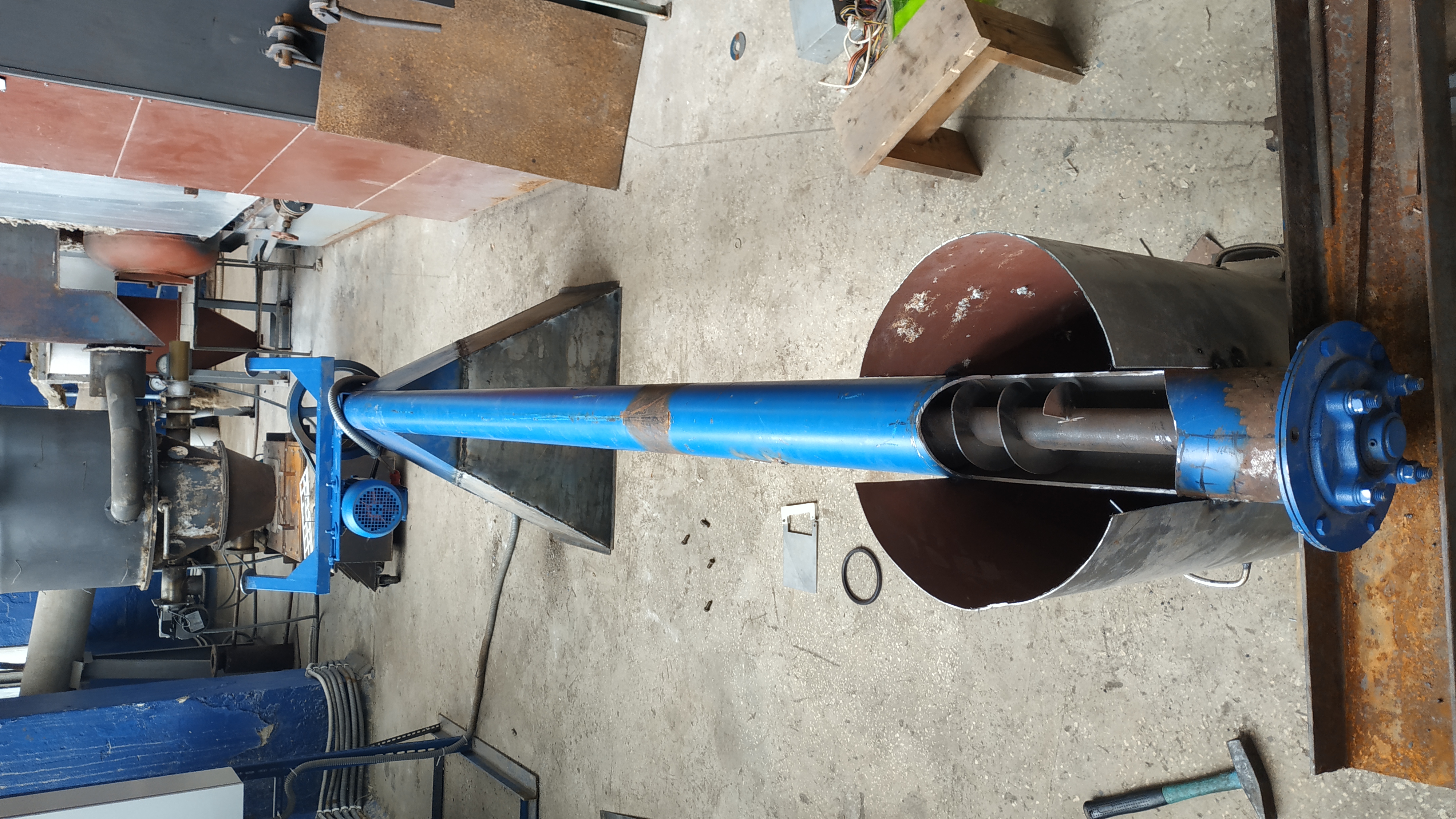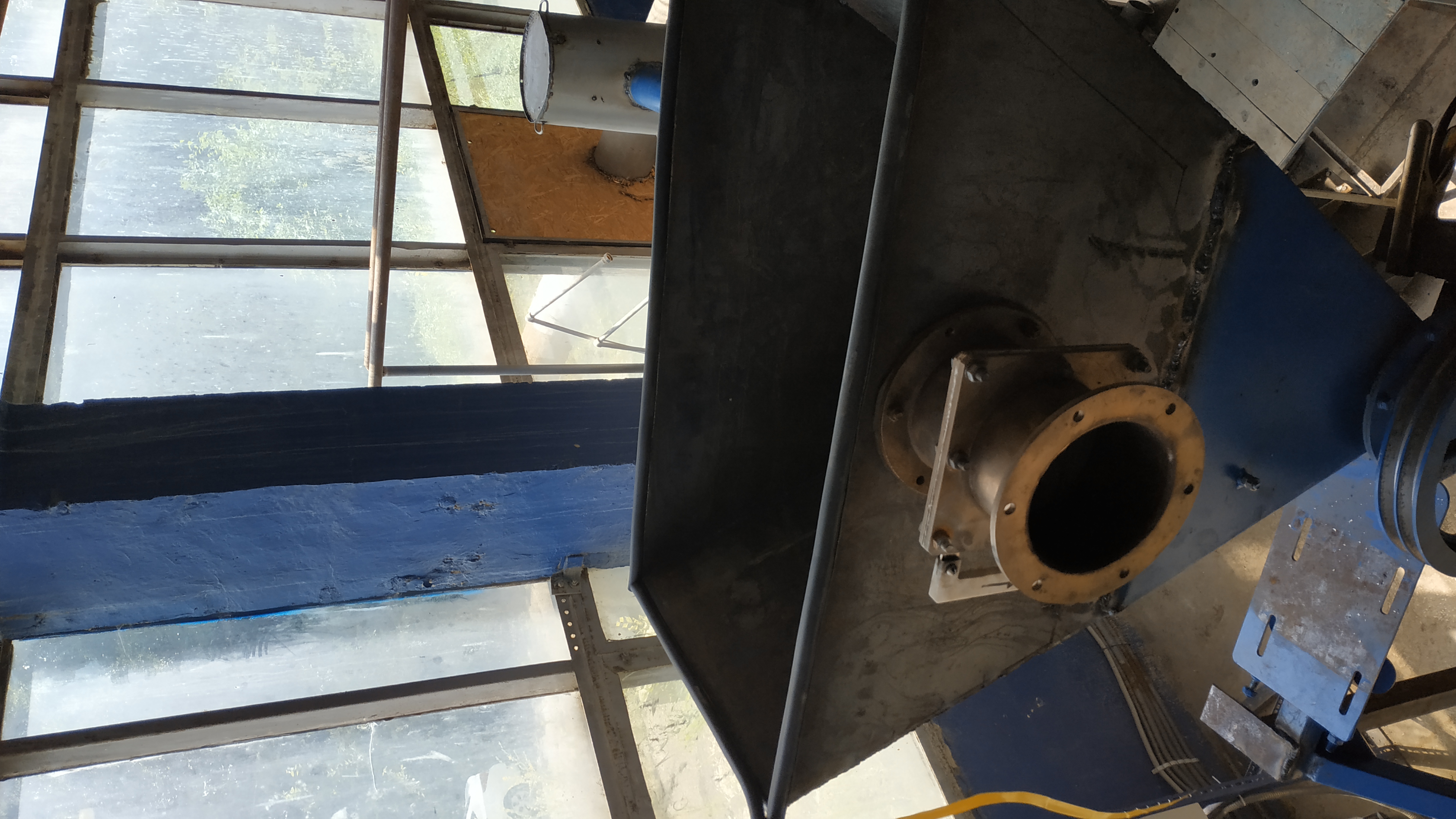 Первый вариант устройства подачи был выполнен со шнеком диаметром 100 мм, переходным водоохлаждаемым патрубком и бункером на 30 литров. Первые пуски реактора производились на имеющемся в нашем распоряжении топливе — лузге подсолнечника, и этот вариант шнека показал себя положительно. Но со многокомпонентным «сложным» альтернативным топливом (с большим числом полиэтиленовых элементов более 100 мм в длину) этот вариант исполнения шнека оказался бесполезен. Постоянные заклинивания устройства подачи не позволяли наладить работы всей установки.