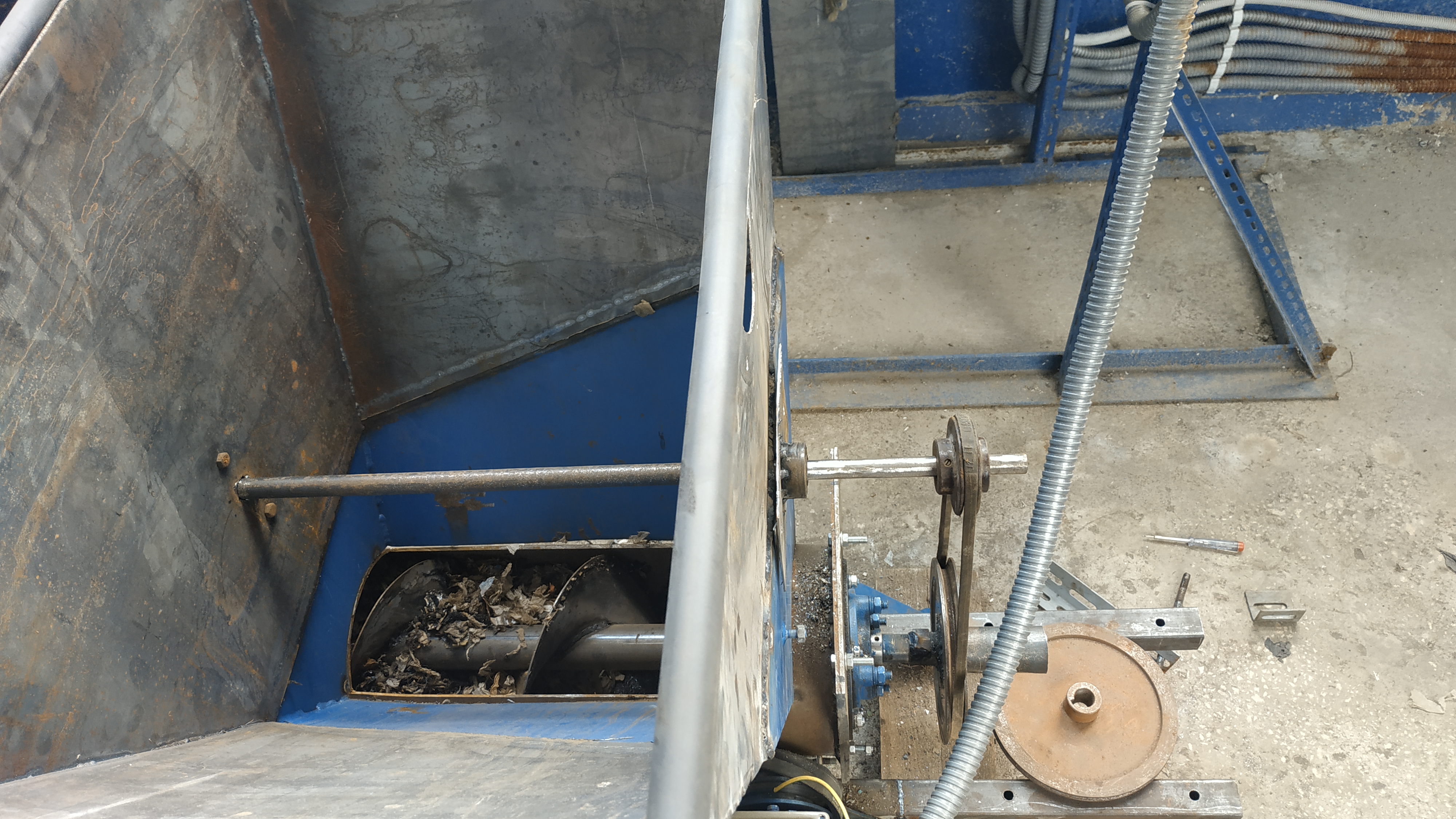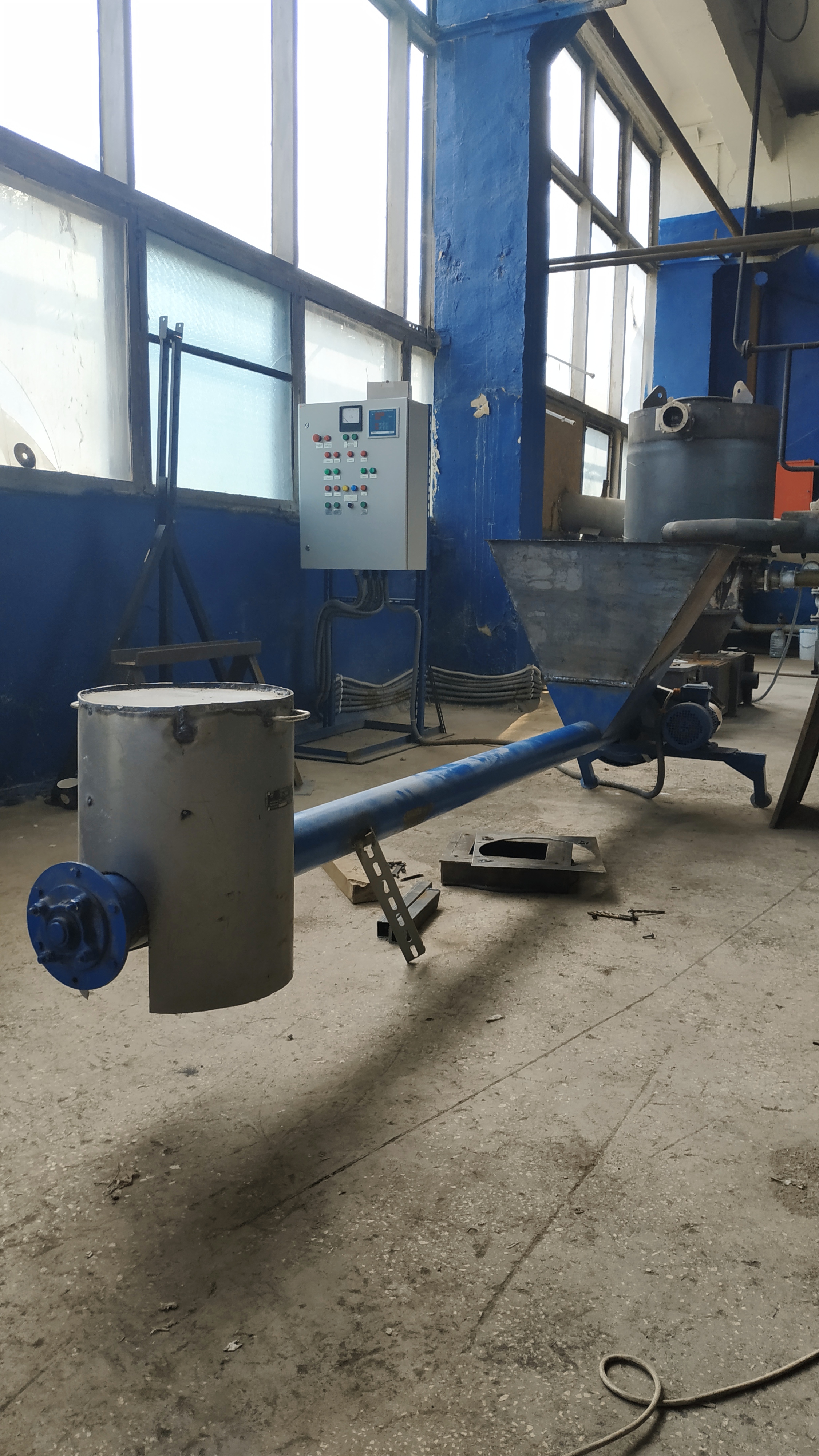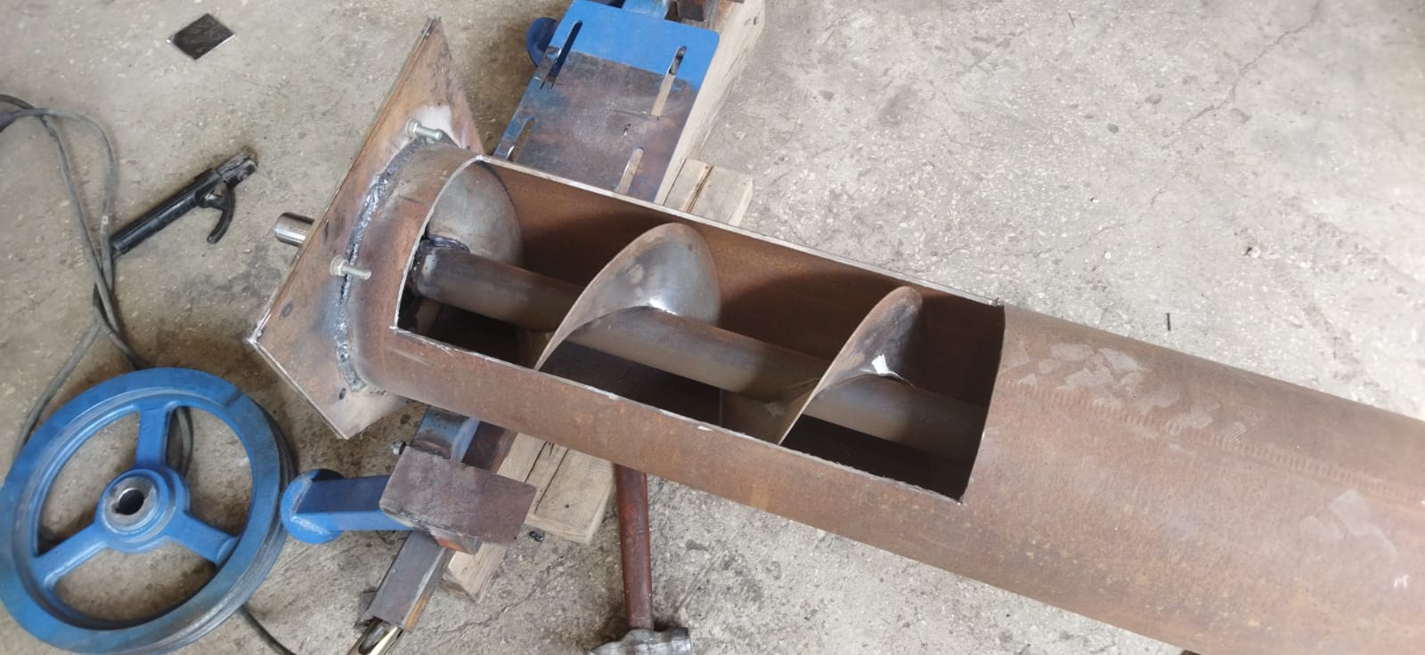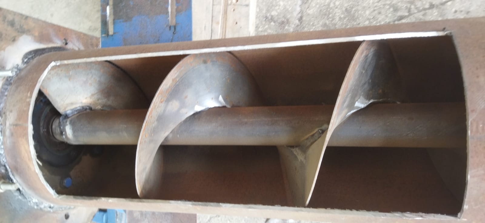Первый вариант устройства подачи был выполнен со шнеком диаметром 100 мм, переходным водоохлаждаемым патрубком и бункером на 30 литров. Первые пуски реактора производились на имеющемся в нашем распоряжении топливе — лузге подсолнечника, и этот вариант шнека показал себя положительно. Но со многокомпонентным «сложным» альтернативным топливом (с большим числом полиэтиленовых элементов более 100 мм в длину) этот вариант исполнения шнека оказался бесполезен. Постоянные заклинивания устройства подачи не позволяли наладить работы всей установки.